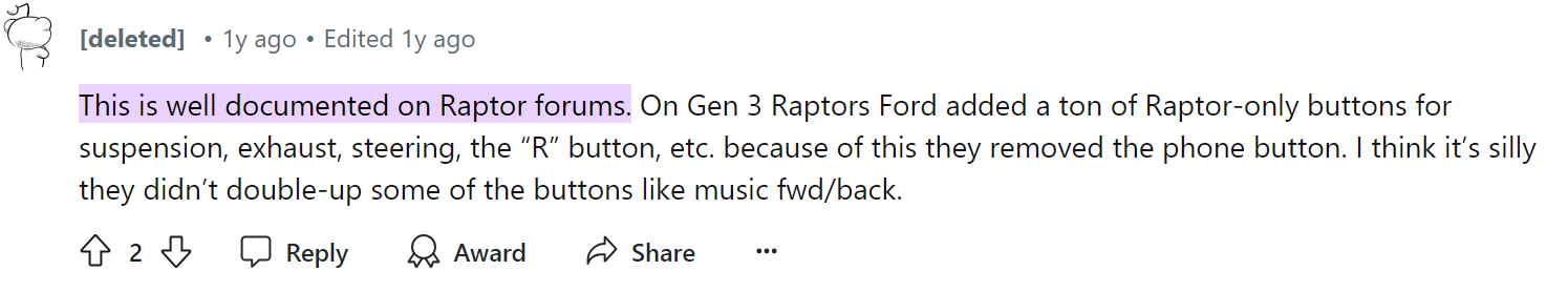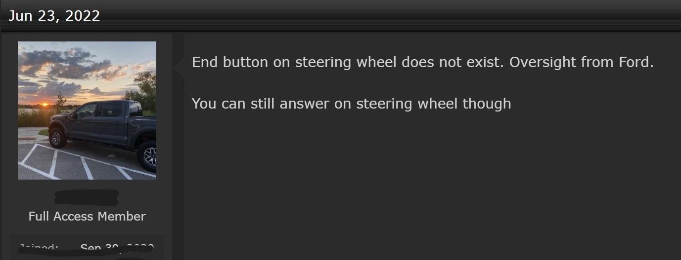 Next, I reviewed available user data including internal current user quality data from surveys and social media forums. Below are two examples from social media forums online. Internal data from customers also suggested users liked having a quick, hands-free method of answering and ending a phone call without having to get distracted by having to take hands off the wheel to end a call on the large infotainment screen. During the research, I found that users in North America were also voicing concerns over the same issue on a different vehicle line exhibiting the same layout (Ford F150 Raptor).